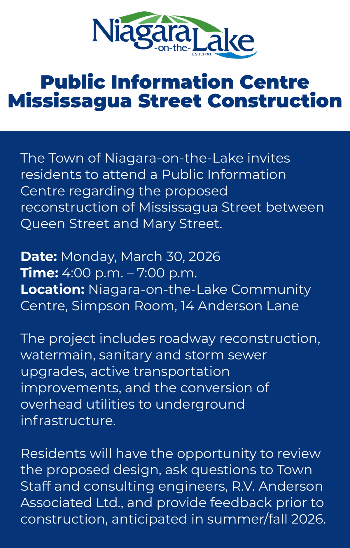 The town is looking to rebuild Mississagua Street from Mary Street to Queen Street, with construction potentially starting in the summer or fall this year.