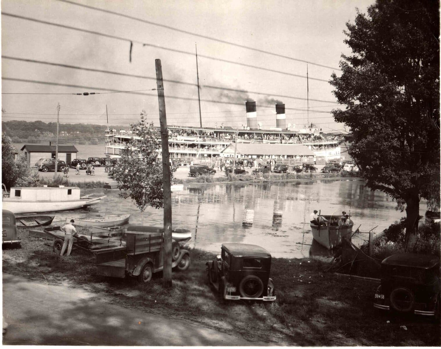 Taken from the balcony of the American Hotel (the King George III Inn) around 1935, this photograph captures a moment when Niagara-on-the-Lake’s docks were bustling with ships, visitors and fishermen. Commercial fishing boats in the basin highlight a time when local fishermen carried on their family tradition, setting nets offshore for whitefish, pickerel and sturgeon. The Cayuga regularly docked in NOTL as it did the day this image was captured. Known as “the ship of romance,” it once brought millions of passengers to NOTL between 1906 and 1957. Though the bustling shipping and commercial fishing eras have ended, this image offers a vivid glimpse into the lively past of this now-quiet corner in town.