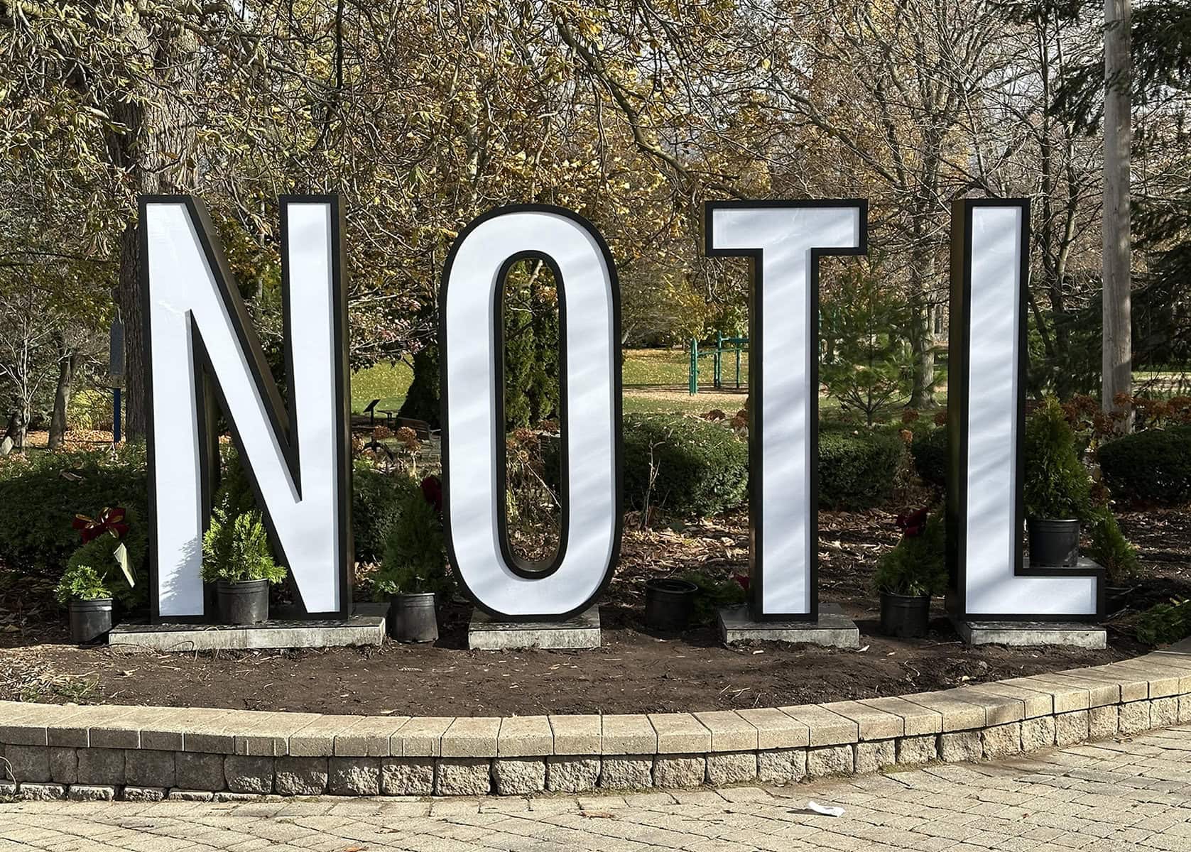 Tourists glance at the giant tacky NOTL sign, shake their heads and take photos.