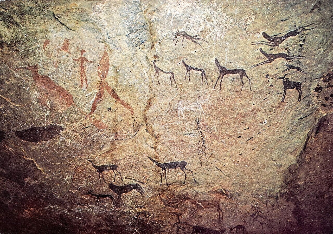 But nothing on the scale and beauty of the famous cave art in what is now Spain, France and Germany, was seen until 50,000 years ago, which continued in fits and starts for the following 40,000 years. Subjects often included now extinct animals such as the ibex, saber-toothed tiger, and cave-lion, as well as stick figure representations of humans and countless outlines and imprints of hands.